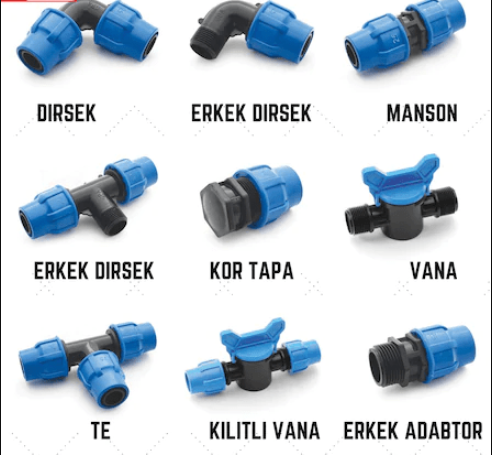 Tarla, bahçe ve peyzaj sulama sistemleri ile tüm bağlantı parçaları.